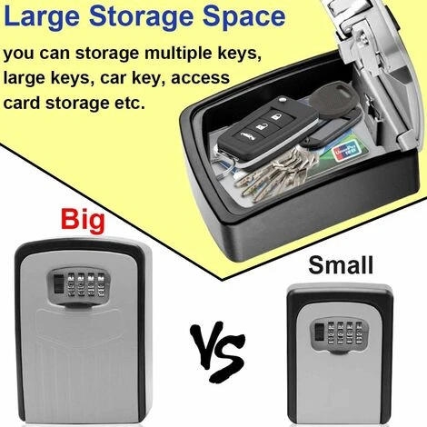 EXTRA LARGE CAPACITY -Grande boîte à clés avec serrure à code a un espace extra large (taille intérieure autour de: 11.5*4.5*8cm) que vous pouvez placer plusieurs clés telles que les clés de la maison, les clés de voiture, la carte de sécurité. Plus de stockage que les conventionnels serrure à clé box. Vous pouvez y mettre vos clés ou vos clés de voiture lorsque vous allez au travail ou en vacances.