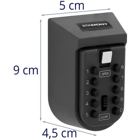 Cacher la clé de la porte d’entrée dans la cave, le garage ou sous le paillasson vous paraît trop risqué? Alors cette boîte à clés pratique de Stamony est faite pour vous! Avec cette boite à clés verrouillable et résistant aux intempéries, vous pouvez placer les clés respectives partout où vous en avez besoin, même à l’extérieur, grâce à son montage mural. Ce coffre à clés est très bien protégé contre les accès non autorisés grâce à une serrure à combinaison à 10 chiffres. Sa serrure permet 1 000 000 combinaisons différentes, si bien que la vôtre est presque impossible à deviner. Laissez-vous convaincre par un service compétent et de haute qualité et achetez un Boîte à clés de Stamony dès aujourd’hui!