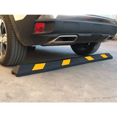 Buttée de délimitation de place de parking en caoutchouc vulcanisé, longueur 1830 mm x largeur 150 mm x hauteur 100 mm, couleur noire avec bandes réfléchissantes jaunes. Livré sans fixation.
