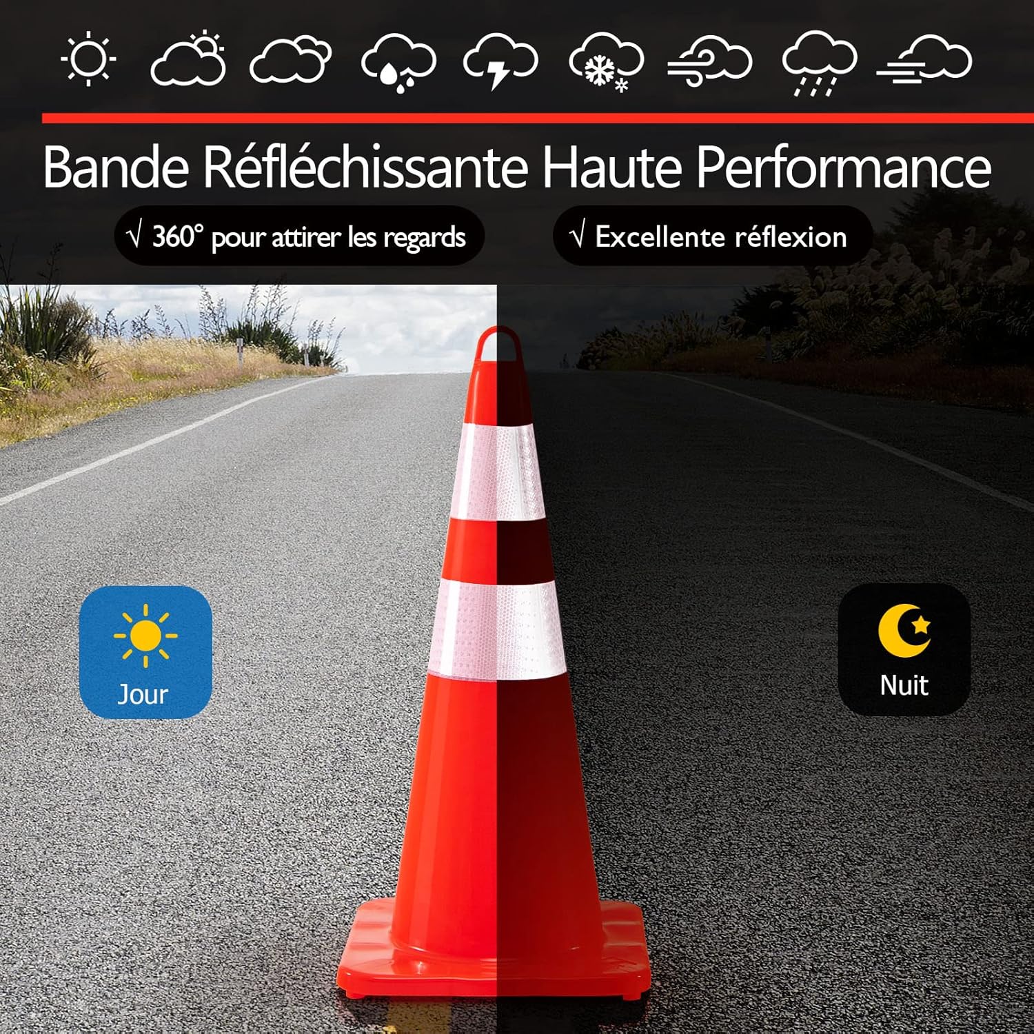 - 【Bande réfléchissante haute performance】le corps principal du cône de signalisation est de couleur orange fluorescent, ce qui attire le regard même si vous êtes loin. De plus, les deux bandes réfléchissantes argentées de 10 cm de large sont très visibles surtout la nuit et par mauvais temps comme les jours de neige ou les jours de pluie. Et vous pouvez le voir à 360 degrés, ce qui garantit une sécurité de haut niveau.