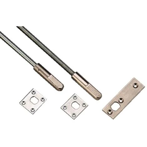 Comprenant : 1 tringle haute Ø 8 x 1500 mm, 1 tringle basse Ø 8 x 1000 mm, 2 embouts à méplats en acier inox, 2 plaquettes guides en acier zingué percées aux cotes des embouts, 1 gâche de sol.