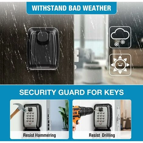 EXCELLENTE IMPERMÉABILITÉ–La boite à clefs avec code est équipée d’un couvercle noir, qui peut protéger efficacement le cadran de la poussière, des pluies acides, de la glace et de la neige, ce qui le rend plus robuste et durable. Le design compact fait ressembler à une prise extérieure protégée contre les intempéries, personne ne le remarquera. Cette coffre fort a clef peut être installée sur le mur / porte ou d’autres endroits secrets comme un placard pour rendre vos clés plus sûres.