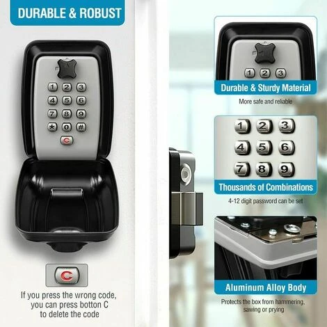 INSTALLATION RAPIDE–L’installation est très simple. Le produit comprend une boite a clefs murale et des outils d’installation pour assurer une installation stable sur n’importe quel mur. Le mot de passe réinitialisable à 12 chiffres offre des milliers de combinaisons pour assurer le plus haut niveau de sécurité. Il est recommandé de prendre une photo ou de l’écrire avec un stylo après avoir défini le mot de passe. Une fois le mot de passe oublié, vous ne pourrez plus utiliser la boîte à clés.
