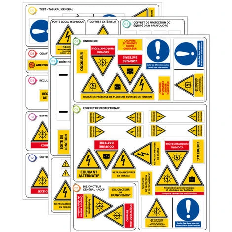 Notre planche d’étiquettes photovoltaïques prête à l’emploi est donc idéale. Retrouvez notamment les étiquettes à poser sur les onduleurs, sur les câbles, à proximité du disjoncteur général…