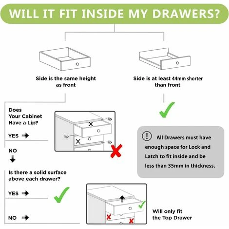 pour enfants. Et les serrures pour bébé ont une fonction déverrouillée. - Conception Invisible: Les serrures s’installent à l’intérieur du meuble ou du tiroir, hors de la vue des enfants et des invités pour rendre votre maison attrayante tout en offrant une protection idéale aux enfants.