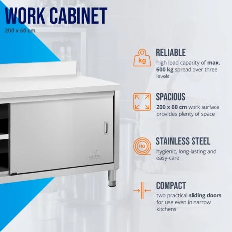 L’armoire de travail RCSSCB-200X60-E de Royal Catering a sa place dans toutes les cuisines gastronomiques équipées professionnellement. La surface de travail de 200 x 60 cm de cette armoire en acier inoxydable vous offre suffisamment d’espace pour travailler au quotidien avec des aliments frais. Équipée de deux portes coulissantes peu encombrantes, l’armoire de travail est particulièrement recommandée dans les cuisines étroites. L’intérieur est divisé par une étagère stable qui, comme l’étagère inférieure et la surface de travail, peut être chargée jusqu’à 200 kg. Il en résulte une énorme capacité de charge totale d’un maximum de 600 kg. L’armoire de travail en acier inoxydable atteint une stabilité optimale même sur des sols irréguliers grâce aux pieds réglables en hauteur. Pour une cuisine mieux rangée, commandez dès aujourd’hui cette élégante armoire de travail !