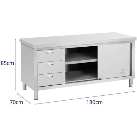Le meuble bas RCSSCB-180X70-S de Royal Catering trouve sa place dans toutes les cuisines professionnelles. Il met à disposition un plan de travail de 180 x 70 cm assez spacieux pour qu’on puisse pour travailler avec les aliments, aromates et appareils de cuisine professionnels jour après jour. Ce modèle possède deux portes coulissantes qui s’ouvrent sans gêner ainsi que trois tiroirs. Il est idéal pour les cuisines étroites. À l’intérieur, l’espace est divisé par une tablette solide qui supporte la même charge maximale que le plan de travail et le fond de l’armoire, soit 200 kg. Au total, ce meuble d’une hauteur de 85 cm a donc une capacité de 600 kg. Pour une stabilité optimale sur les sols inégaux, il est doté de pieds réglables en hauteur. Mettez de l’ordre en cuisine avec un élégant meuble bas !