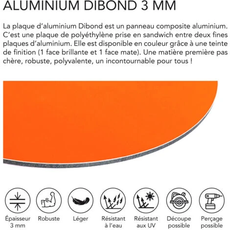 Le Dibond ou Alupanel est un panneau composite aluminium. Il s’agit d’une plaque de polyéthylène, placée entre deux fines couches d’aluminium. Ultra léger, résistant aux intempéries, aux UV, le dibond est un matériau idéal pour le bricolage, la rénovation, mais aussi pour la signalétique, les panneaux publicitaires, l’agencement intérieur, les enseignes, les stands et présentoirs. Disponible en blanc, rouge, bordeaux, bleu, jaune, noir, orange et gris, et en 3 mm d’épaisseur, il est adapté à un usage intérieur/extérieur. Pliable, cintrable à froid, imputrescible, anti-rouille, inoxydable, c’est la matière aluminium parfaite !
