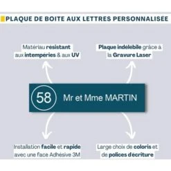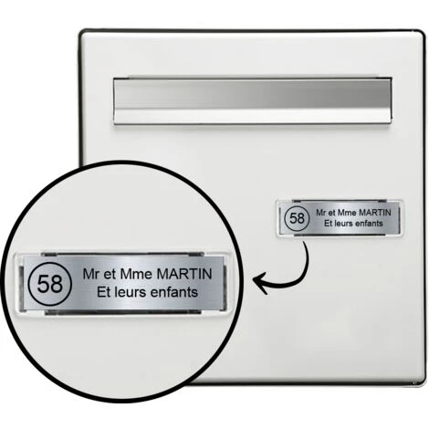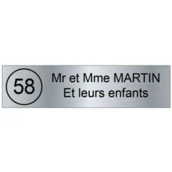 Plaque de boite aux lettres avec numéro personnalisée au format 100 x 25 mm de couleur argent écriture noire. 2 lignes de texte, choix de 12 polices de caractères.