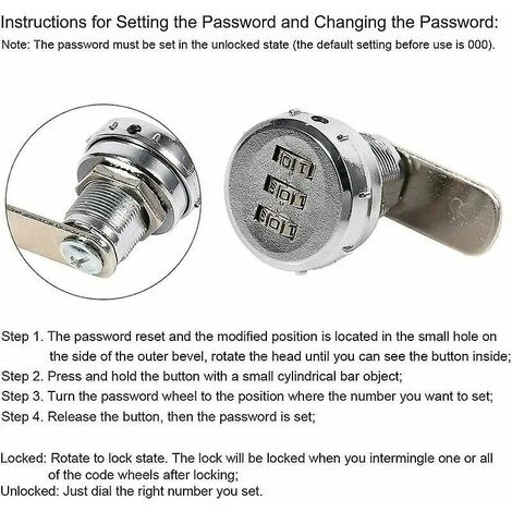 Serrure d’armoire Réglage:Le mot de passe initial pour le verrouillage de code est 000 et il existe 1000 combinaisons de mots de passe. Vous pouvez changer le mot de passe vous-même. Vous n’avez pas besoin d’installer de vis pour installer le verrou directement sur le boîtier. Lors du changement de mot de passe, la main doit toujours tenir le trou pour le code jusqu’à ce que le mot de passe soit modifié.