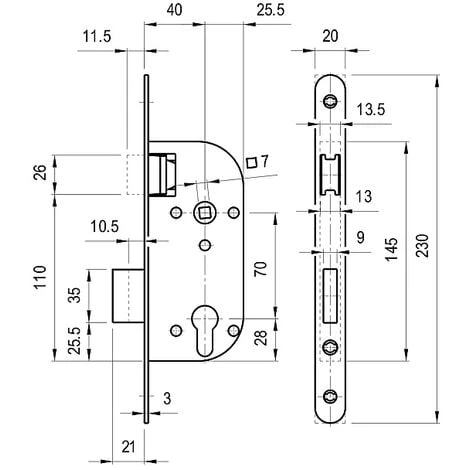 Pour portes intérieures. Fermeture silencieuse, facile et fluide sans avoir besoin d’actionner la béquille. Utilisation possible avec tout type de ferme-porte. Têtière à bouts ronds en inox de 230 x 20 mm et gâche en inox. Coffre de 145 mm x 62,5 mm. Entraxe : 70 mm. Carré de 7 mm. Réversible.