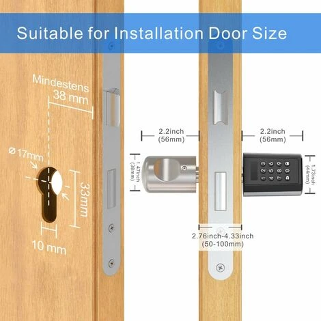 [taille du cylindre de verrouillage] diamètre de la poignée: diamètre extérieur 46mm / diamètre intérieur 38mm; Longueur: 56mm à l’extérieur / 57mm à l’intérieur. Longueur du cylindre de verrouillage: réglable 40mm – 55mm à l’extérieur / 30MM – 60mm à l’intérieur. La distance entre le Centre du trou de verrouillage et le cadre de la porte est supérieure ou égale à 40mm. La serrure de code s’applique à la serrure de porte blindée de 50mm – 100mm d’épaisseur.【 installation facile 】 la serrure numérique n’a besoin que de remplacer le cylindre de la serrure et n’a pas besoin de remplacer le corps de la serrure d’origine. L’installation doit être terminée dans les 5 minutes sans forage. Il est alimenté par 3 piles AAA. Veuillez noter que la batterie n’est pas incluse dans la livraison. Si la batterie est épuisée, la clé USB de secours peut déverrouiller la connexion. Notez que le port usb ne supporte pas cette charge.[méthode de déverrouillage pratique] ouvrez la porte par mot de passe et carte. Les serrures de stockage peuvent encoder jusqu’à 10 groupes de mots de passe (dont 1 avec fonction d’administrateur). La serrure intelligente peut être connectée à un maximum de 20 cartes. Serrure intelligente avec mot de passe temporaire.[garantie prolongée d’un an + un an] Si vous n’êtes pas amoureux dans les 30 jours, nous offrons une garantie de remboursement. Si vous avez des questions concernant l’installation, le fonctionnement, etc., n’hésitez pas à nous contacter.