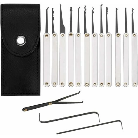 - 【Kit professionnel】 – Cet ensemble de formation au crochetage comprend 15 crochets de serrure et 1 sac en cuir noir, qui peuvent maîtriser le fonctionnement et le principe de fonctionnement de la serrure plus rapidement et mieux, devenant ainsi les
